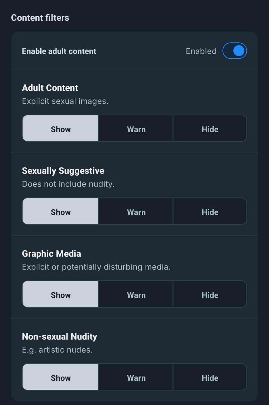 Once you confirm your age, you can enable adult content and set how to filter explicit posts (either showing them, get them flagged by a warning or hidden entirely). ATTENTION: in the main moderation page, at the bottom, there's another separate filter for "Sexually Suggestive (Cartoon)" that you might want to turn off as well! (I personally like to live my life dangerously and keep every nsfw filter off, letting strangers see how much unhinged is the guy sitting next to them in the metro)