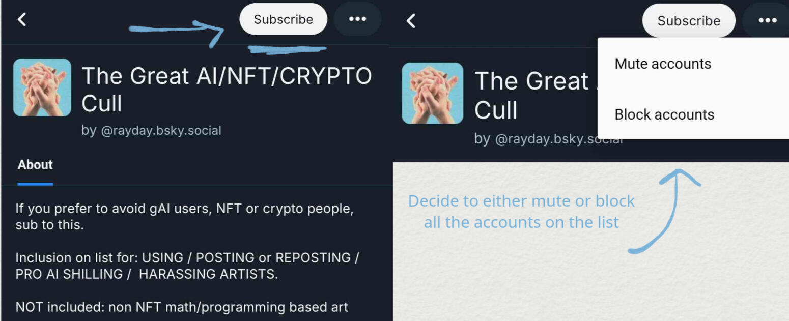 ☒Blocking the creator of a list or starter pack will remove you from it. (Doesn't work for moderation lists though! The bright side is that people in a moderation list you created/subscribed to can'tevade the block)Mute. Muting prevents you from seeing any notifications or top-level posts from an account. If they reply to a thread, you’ll see a section that says “Post from an account you muted” with an option to show the post. The account will not know that they have been muted.