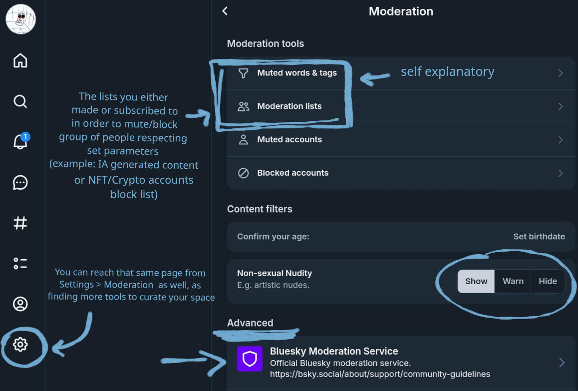 YOU CAN DO IT FROM THIS PAGE. There'll find how to directly hide or receive a warning for sensitive content or mentions of topics that go against Bsky's ToS (hate speech, discrimination and so on). This wants to be an extra safety measure in addition to the main moderation system taking care of content that is not allowed on the platform.