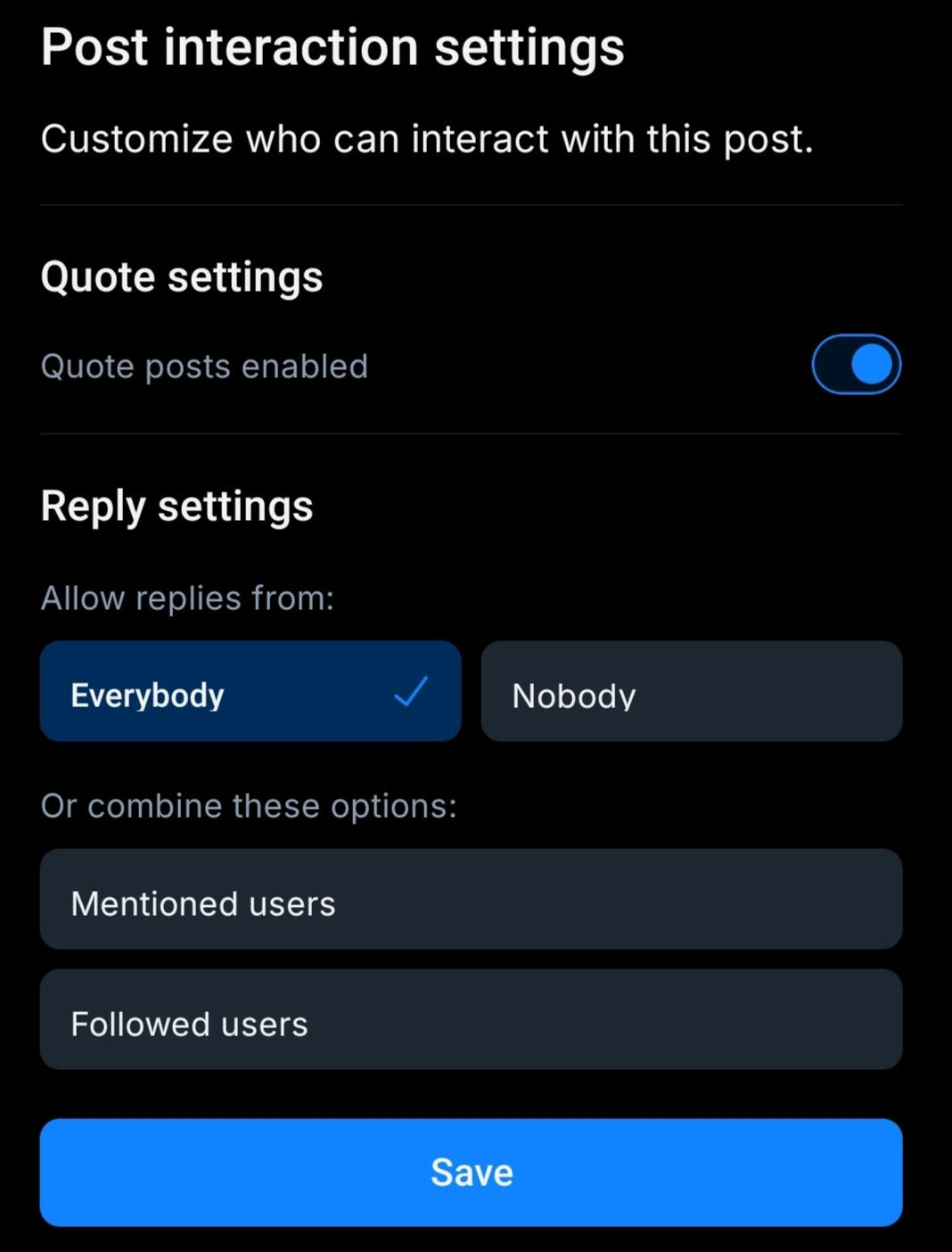 For each post you make on Bsky you can decide not only who can reply, but to also disable quotes! (YEAH ARTISTS, YOU HEARD IT RIGHT)